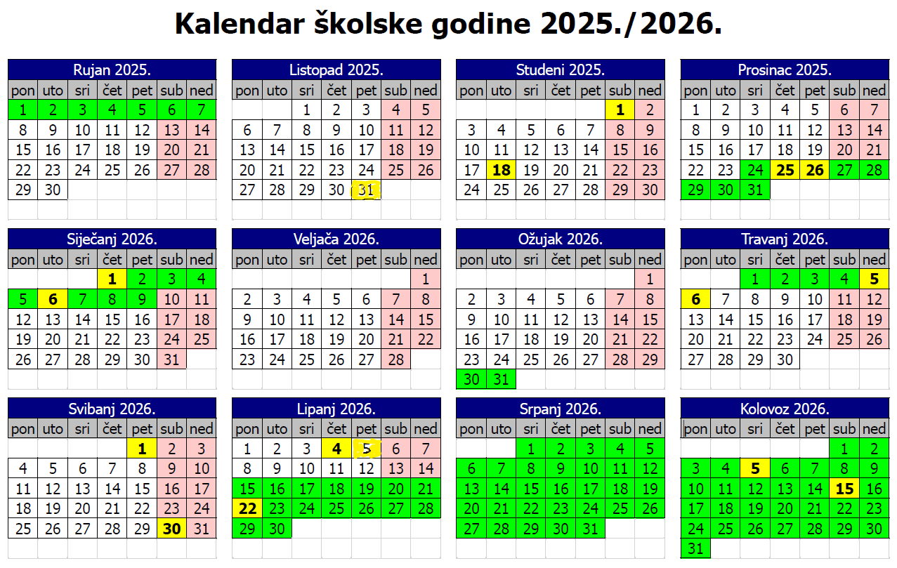 Prema Godišnjem planu i programu rada OŠ Miroslava Krleže, nenastavni dani u školskoj godini 2025./2026. su