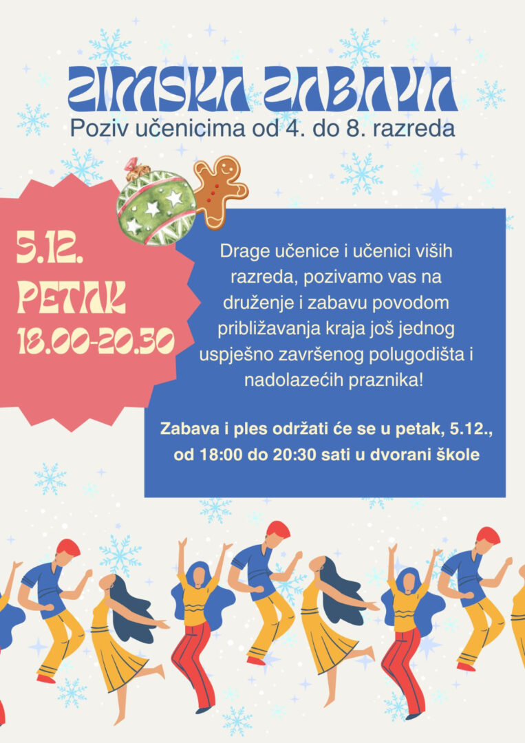 pozivamo učenike od 4. do 8. razreda na zabavu i plesnjak u školskoj dvorani, uz glazbu koju će puštati profesionalni DJ.